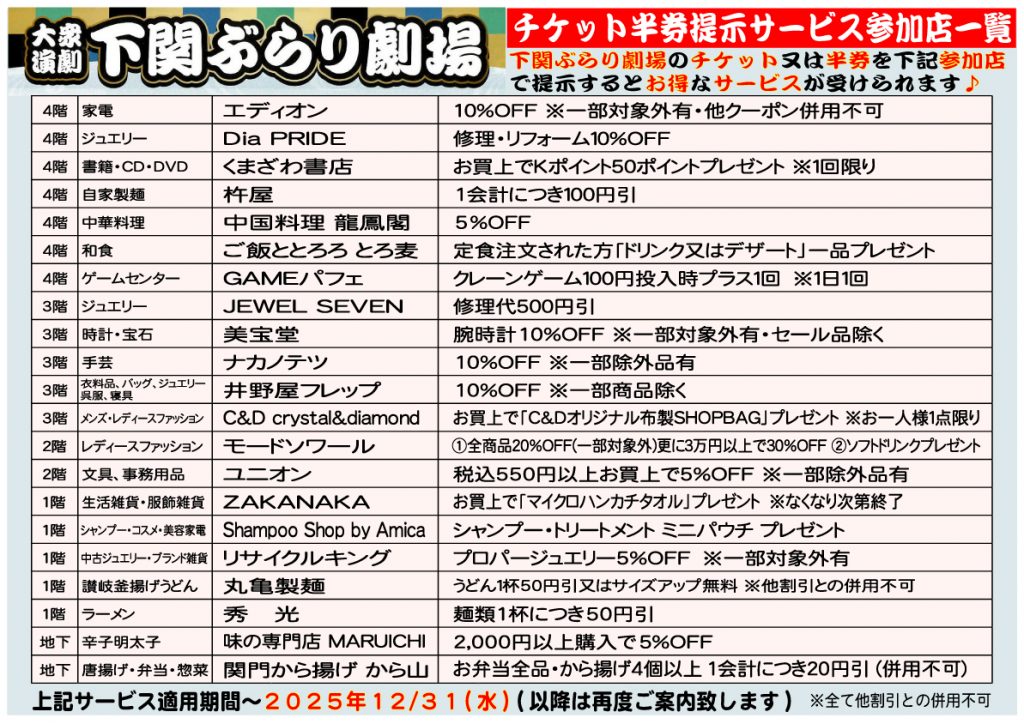 山口県に大衆演劇場復活!!「下関ぶらり劇場」絶好調公演中!! 9月よりよりリーズナブルになりました!! 只今電話予約受付中!! 詳しくは画像参照 下関ぶらり劇場のチケット又は半券を下記参加店でご提示いただくと「お得」なサービスが受けられます!!