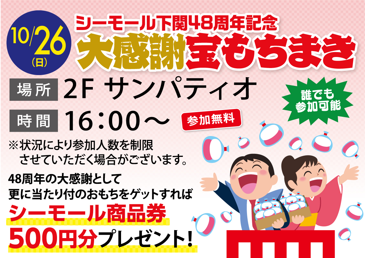 大感謝!宝もちまき 大感謝!宝もちまき 2025年10月26日(日) 16:00~ シーモール2Fサンパティオ 誰でも参加可能!更に当たり付のおもちをゲットすればシーモール商品券500円分プレゼント! ※詳細は画像をご確認お願いいたします。